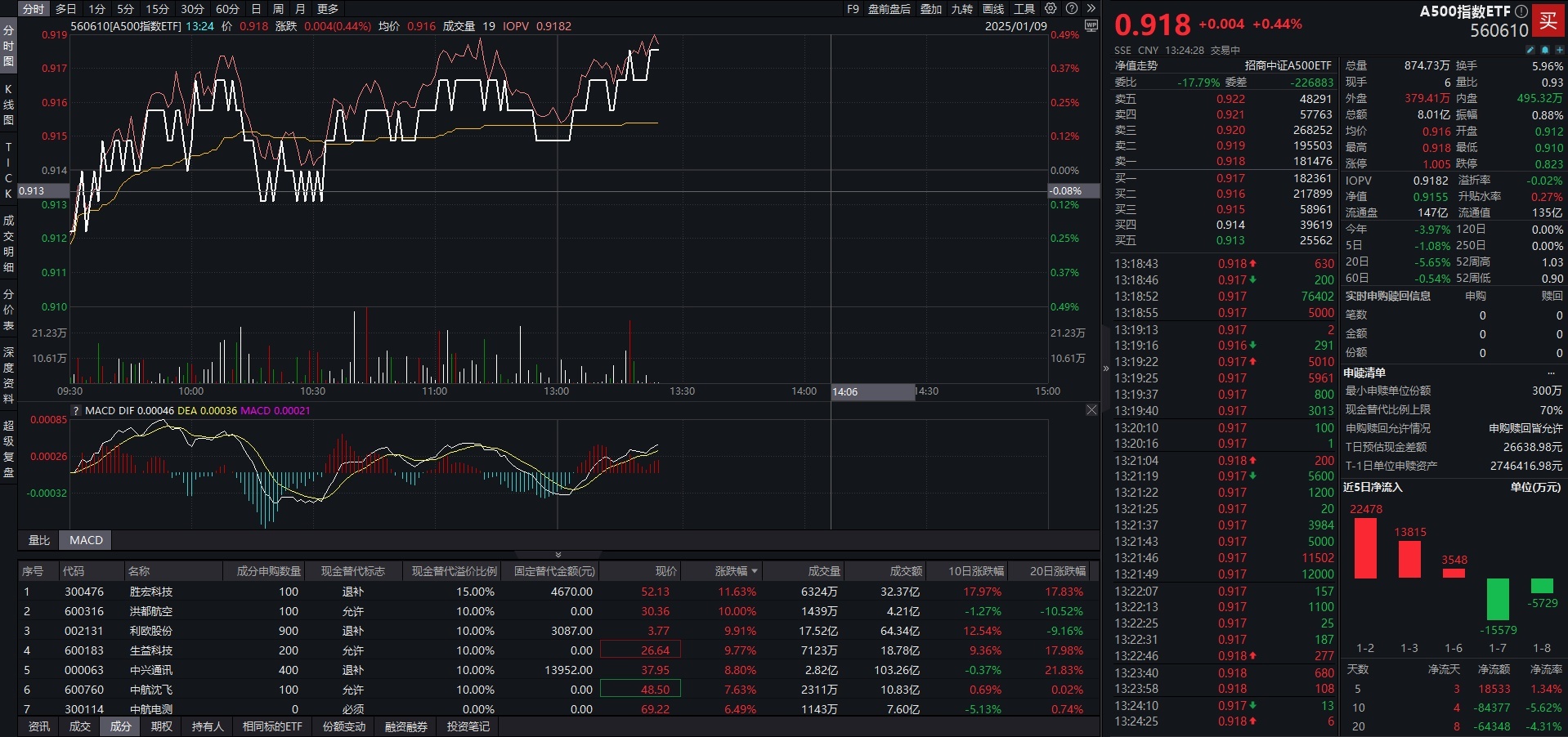 1月9日午后,三大指数涨跌不一,深成指、创业板指飘红。盘面上,国防板块午后异动拉升,涨幅居申万一级行业第一;PCB、人形机器人、毫米波雷达、液冷服务器等概念涨幅领先。截至发稿,中证A500指数涨0.28%。