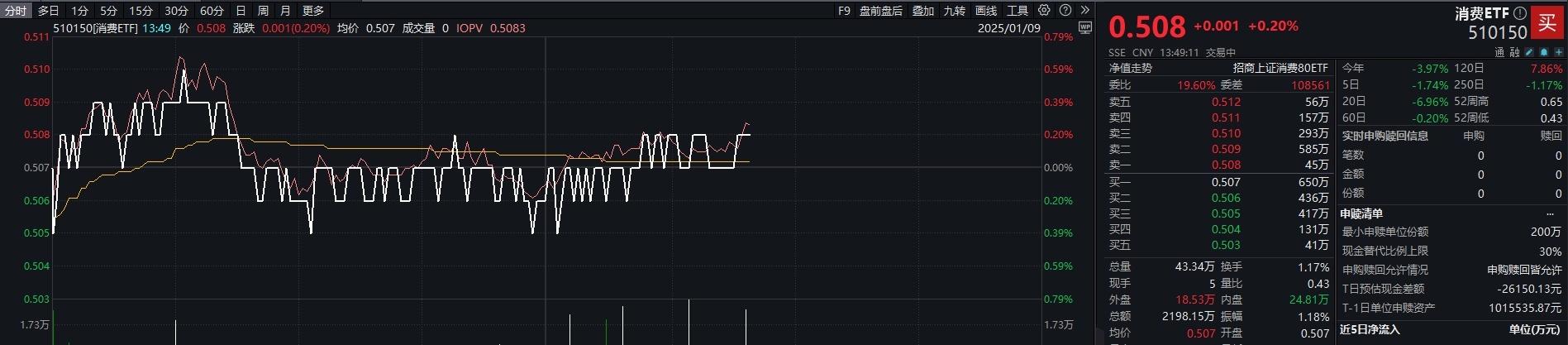 相关ETF方面,截至发稿,消费ETF(510150)窄幅震荡,午后翻红涨0.20%,换手率1.17%;成分股方面,拓普集团涨超8%,海信视像、迎驾贡酒、益丰药房、中炬高新等个股涨幅居前。