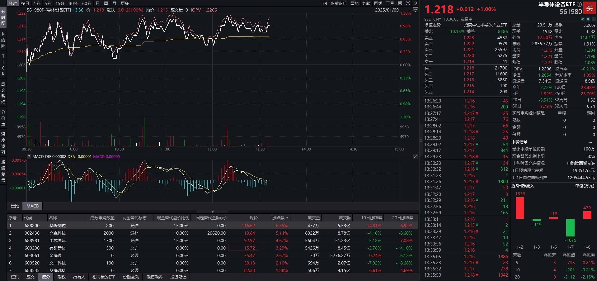 相关ETF方面,半导体设备ETF(561980)涨1%,换手率3.2%,盘中交投活跃。成分股方面,华峰测控涨超6%,兴森科技、中芯国际涨超4%,有研新材、金海通、文一科技等个股涨幅居前。